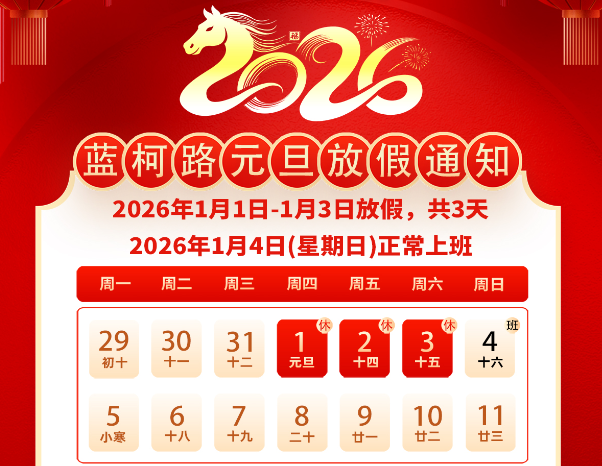 尊敬的客户:2026年元旦即将到来,根据国务院办公厅发出的关于2026年元旦假期安排的通知,结合我司运作情况,现将2026年元旦放假安排如下:元旦放假时间:2026年1月1日-3日,共3天。1月4日(星期日)正常上班。元旦假日期间蓝柯路阿里巴巴店铺照常营业,订单发货延迟到正常上班日(1月4日),在此期间如您有紧急
