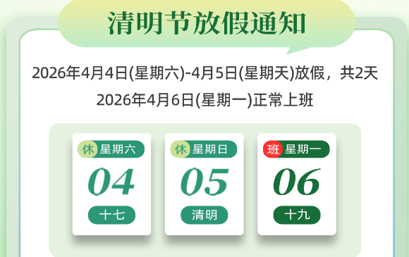 尊敬的客户:2026年清明节即将到来,根据国务院办公厅发出的关于2026年清明节假期安排的通知,结合我司运作情况,现将2026年清明节假期安排如下:清明节放假时间:2025年4月4日-4月5日,共2天。4月6日起正常上班。节假日期间蓝柯路网购店铺照常营业,订单发货延迟到正常上班日,在此期间如您有紧急事情,请直接